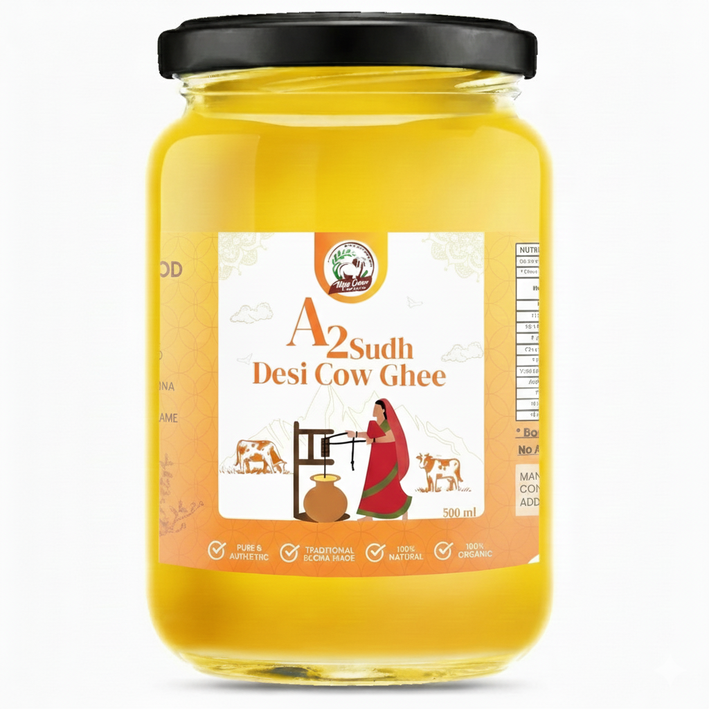 Traditional & Nutrient-Rich Ghee – Milk Ocean A2 Desi Cow Ghee A2 protein wali Desi Gai ke doodh se traditional Bilona method mein tyaar hota hai. For example: Pehle doodh se dahi banaya jata hai, phir use haath se mathkar makhan nikala jata hai, aur phir dheemi aanch par pakaya jata hai, jis se ghee ki medicinal properties, aroma aur rich taste preserved rehte hain. Isme natural Omega-3 fatty acids aur Vitamin A, D, E, K hote hain jo immunity, joint flexibility aur skin glow ko support karte hain. For example: Roz subah doodh ya khane mein ek chamach lene se body ko energy aur smooth digestion milta hai. Yeh ghee 100% chemical-free hai, bina kisi artificial flavor ya preservative ke, isliye pure, safe aur daily cooking ke liye ideal hai.